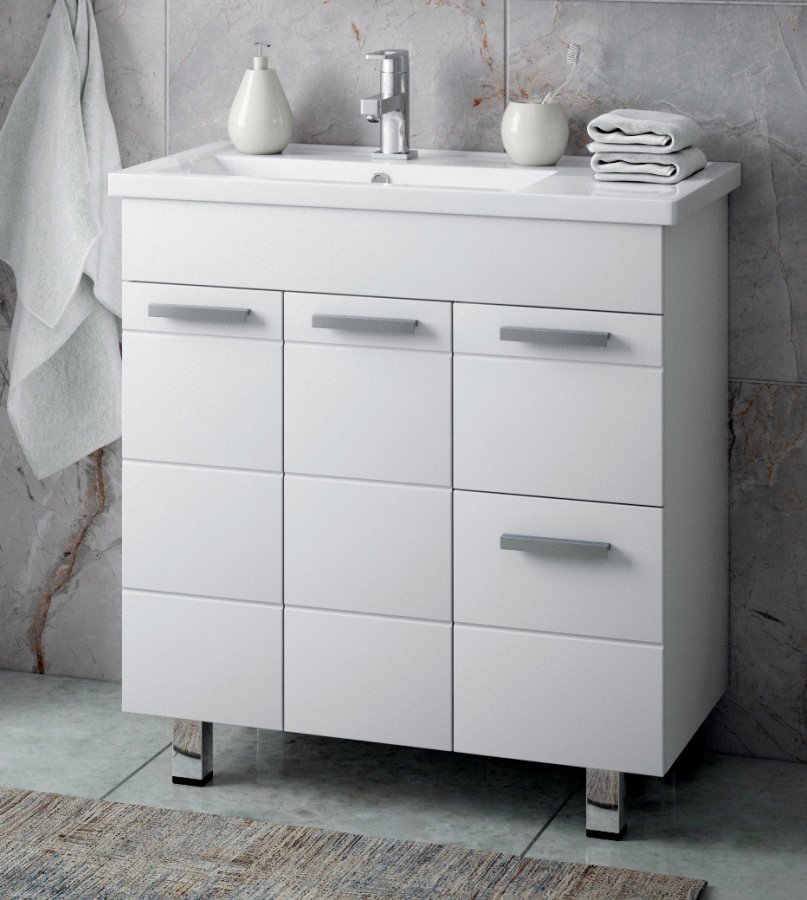 Комплект мебели Corozo Денвер 80 Z2 белый выделяется современным дизайном, выполненным в манере минимализма. Линейный декор фасадной части, дополненный строгой хромированной фурнитурой, гармонично сочетается с эффектным глянцевым покрытием корпуса мебели. Вместительная тумба напольного монтажа идёт в сборе вместе с асимметричной фаянсовой раковиной правого расположения, внутри модуля установлены скрытые полки хранения и два выдвижных ящика на шариковых направляющих. Навесное зеркало-шкаф с подсветкой функционально завершает умывальную зону.