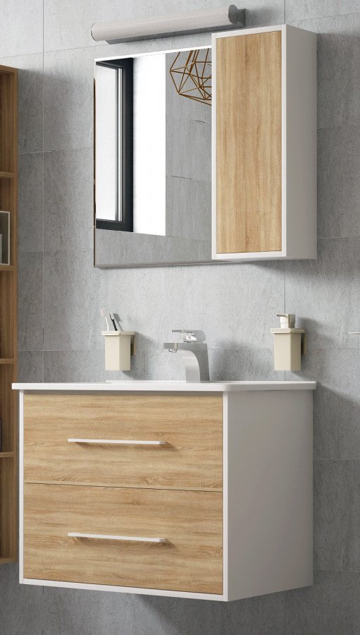 Комплект Corozo Гольф 40/65 сонома – это современная мебель для ванной комнаты, выполненная в приятном и теплом оттенке, создающем атмосферу комфорта и уюта в помещении. Подвесная модульная конструкция предметов спроектирована с применением простых лаконичных форм и прямых линий. В поставку набора входит тумба с двумя выдвижными ящиками, раковина с готовым отверстием под смеситель и зеркало, адаптированное для размещения вместе с одностворчатым шкафчиком, предложенным в дополнительной комплектации.
