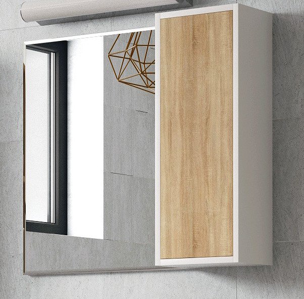 Внимание! В комплект мебели входит только зеркало и тумба с раковиной. Шкафчик навесной (на фотографии комплекта) заказывается отдельно. Шкафчик навесной может располагаться, как справа так и слева от зеркала.