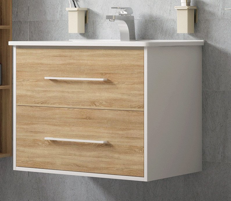 Комплект мебели Corozo Гольф 60/65 сонома обладает привлекательным современным дизайном и стандартным размером, что делает модель адаптивной для размещения в небольших пространствах ванных комнат. Спроектированный на основе прямоугольных модулей – подвесной тумбы с раковиной и навесного зеркала, набор монтируется к стене при помощи подвесов "Scarpi". Фасадная часть тумбы выполнена во внешне приятной и теплой по тону ламинированной поверхности, имитирующей фактуру дерева. Боковые элементы и кромки покрыты итальянской глянцевой полиуретановой эмалью.