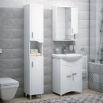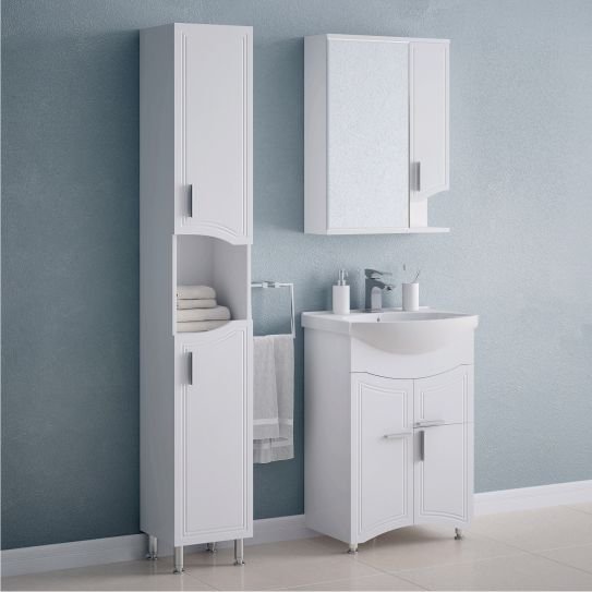 Комплект мебели Corozo Креста 55 белый олицетворяет строгость, элегантность и стильную геометрию форм. Напольная тумба с двумя распашными дверцами со встроенными петлями-доводчиками и выдвижным ящиком, высотой 11 см., гармонично дополняется фарфоровым умывальником идеальной полукруглой формы. Навесной модуль решен двумя зонами хранения – зеркальной секцией с внутренними полками и компактным боковым ванным шкафчиком. Изделия произведены из современных влагостойких материалов, покрытых качественной глянцевой пленкой.