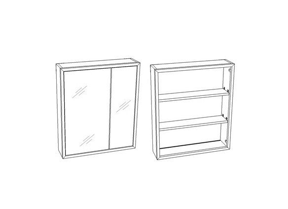 Зеркало-шкаф закреплено на металлическом каркасе.У зеркала-шкафа 2 распашные двери разного размера, в которых используются специальные толкатели, чтобы мягко открывать закрывать их. Шкаф является универсальным, то есть перевернув его, можно расположить большую дверь справа или слева.
